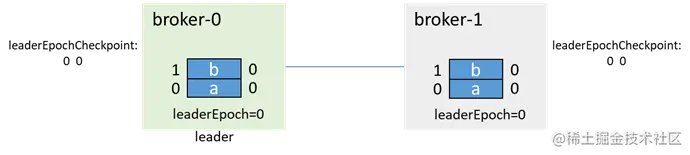 初始时,broker-0 为 leader,broker-1 为 follower,各有两条消息 a、b: