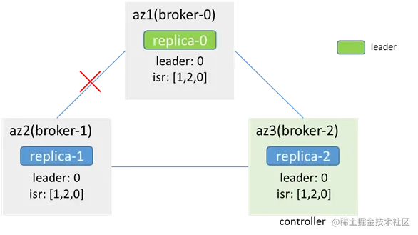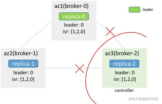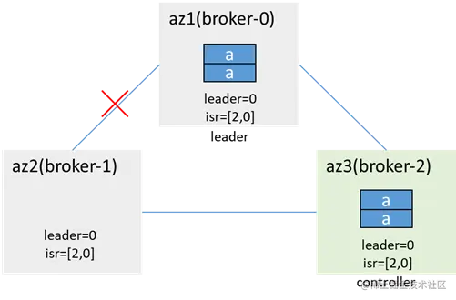 zk-0 和 zk-1、zk-2 不通,少于半数,az1 内 zk 不可用,broker-0 无法访问 zk,不会发生 controller 选举,controller 还是在 broker-1