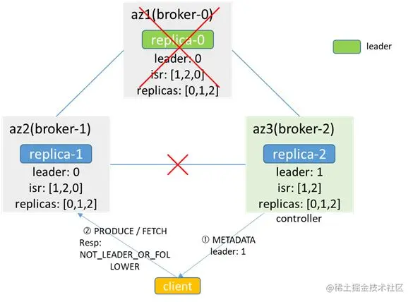 broker-0 无法访问 zk,感知不到节点变化,metadata 不更新(leader:1,isr:[1,0,2]),依然认为自己是 follower,leader 在 1;az1 内的客户端无法生产消费