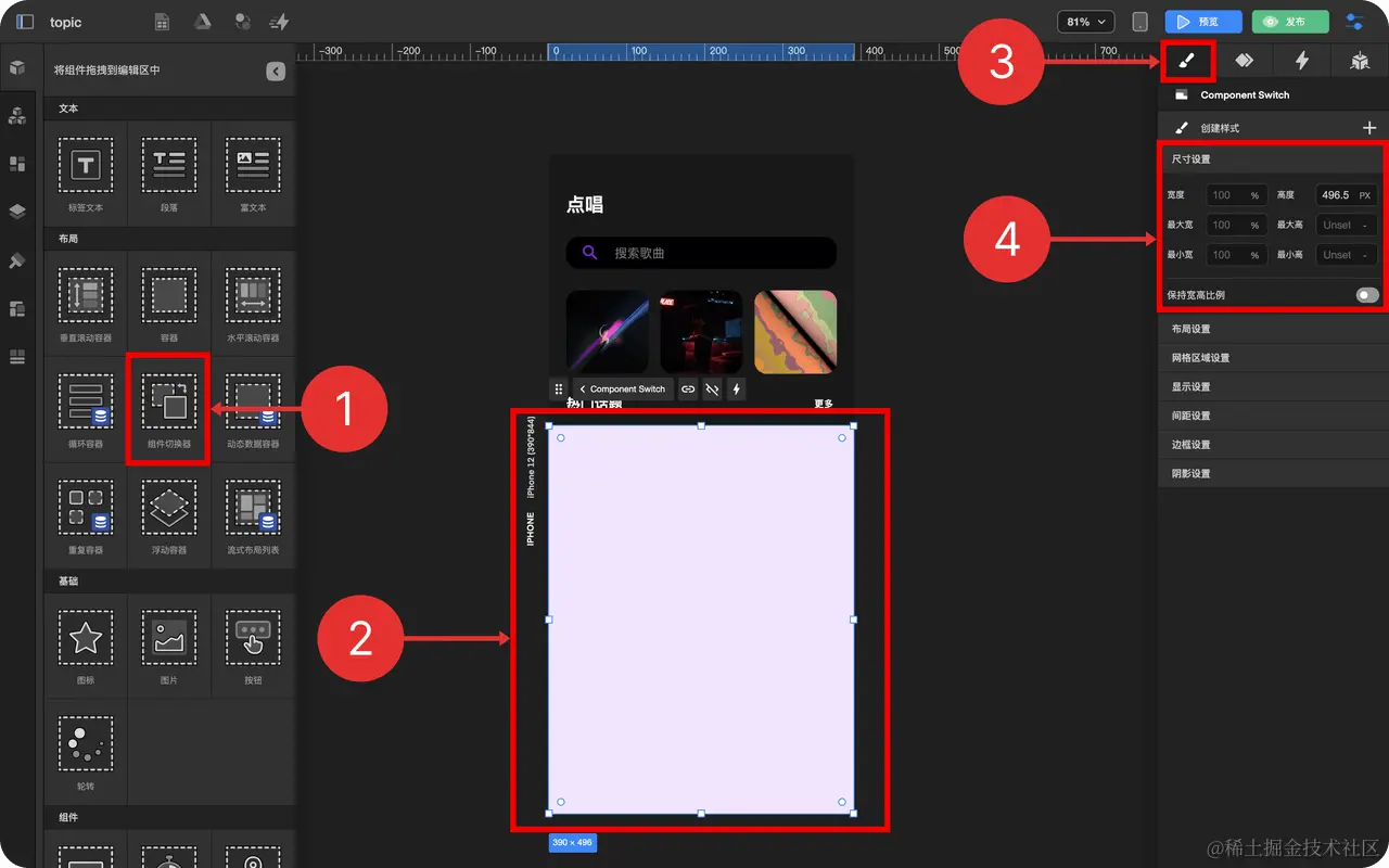 - 拖拽 组件切换器 到 背景素材上