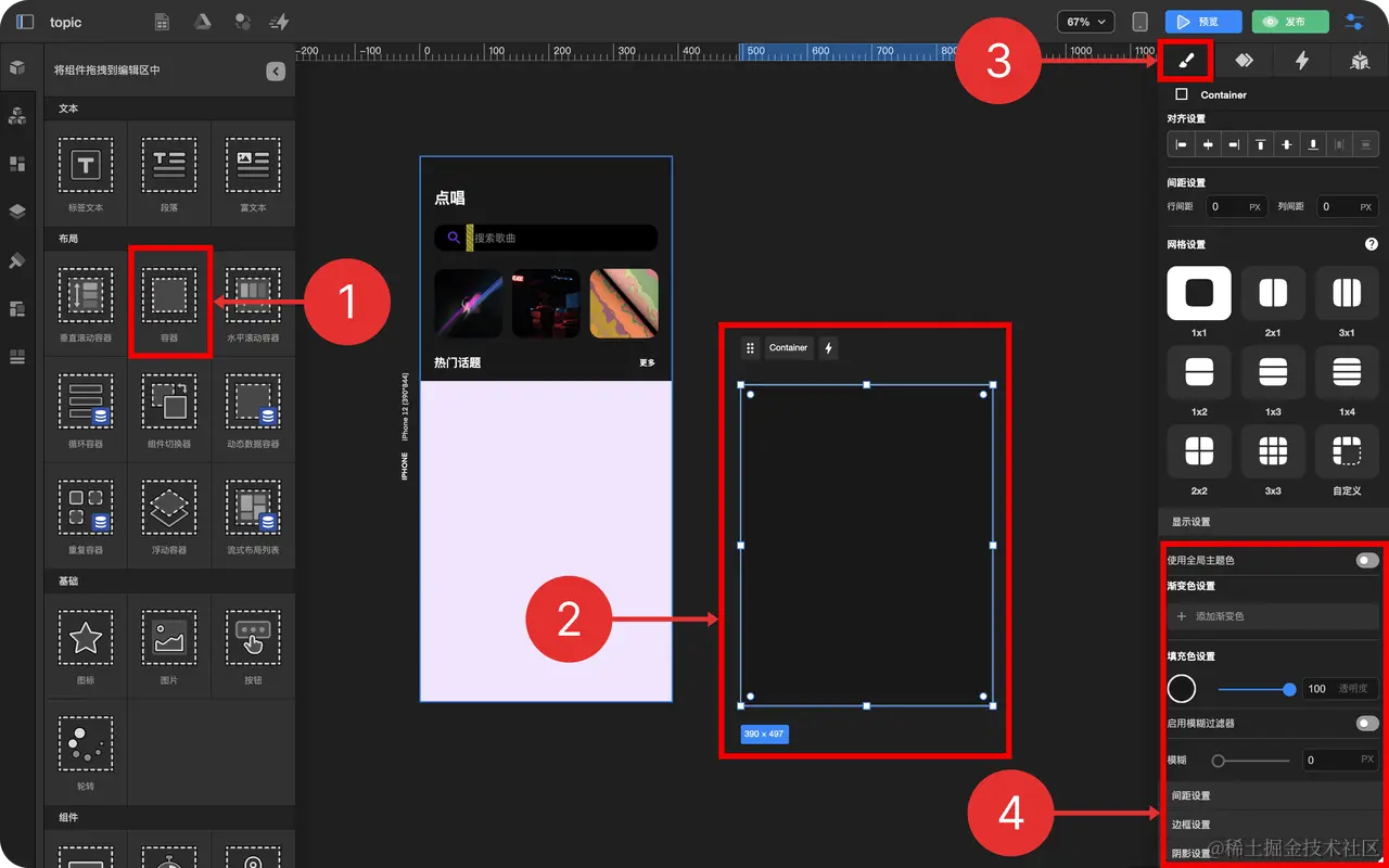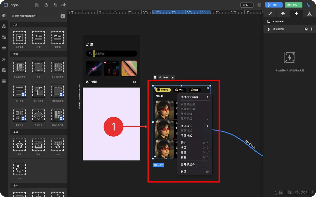 - 拖拽 容器 到 编辑区