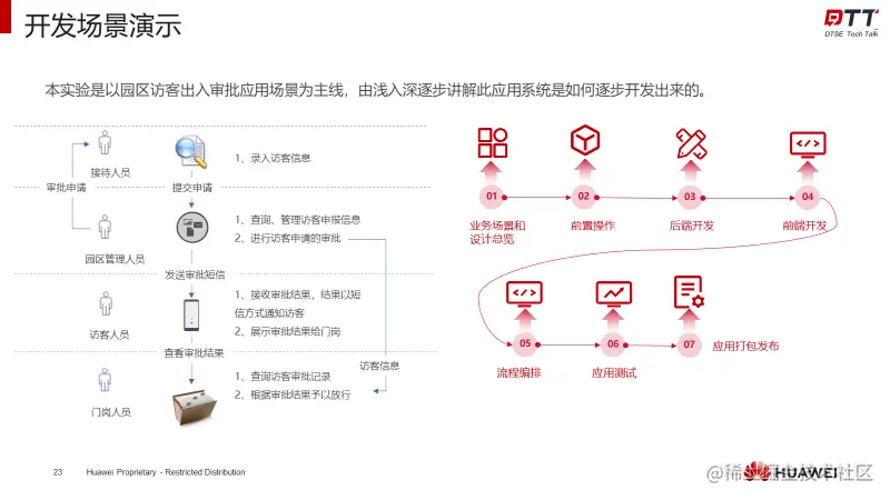 结束理论介绍后,两位老师以园区访客出入审批应用场景为主线,为开发者讲解此应用系统是如何逐步开发出来的。在正式开始动手进行应用构建前,董鑫武老师先分析了该应用涉及到的用户角色、相关业务交互流程和关键的交互页面,并交待了使用AppCube进行该应用开发的工作顺序。
