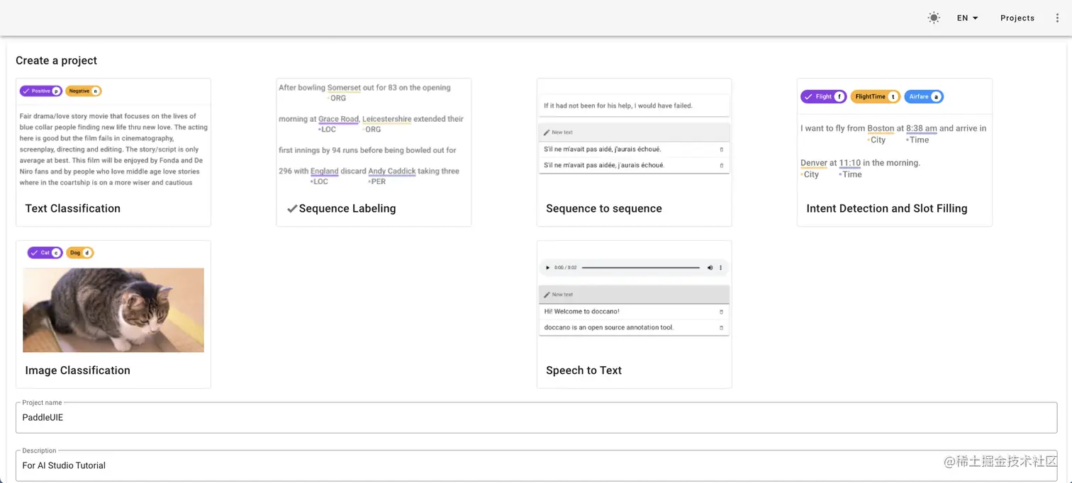 我们推荐使用数据标注平台doccano 进行数据标注,本案例也打通了从标注到训练的通道,即doccano导出数据后可通过doccano.py脚本轻松将数据转换为输入模型时需要的形式,实现无缝衔接。为达到这个目的,您需要按以下标注规则在doccano平台上标注数据: