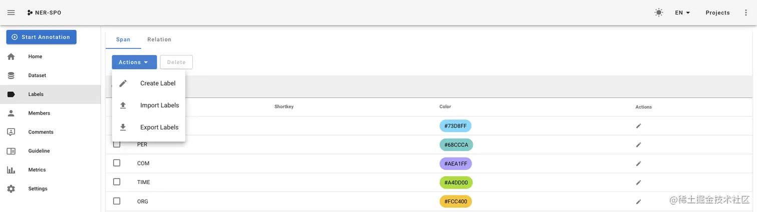 Actions,Create Label手动设置或者Import Labels从文件导入。- 最上边Span表示实体标签,Relation表示关系标签,需要分别设置。