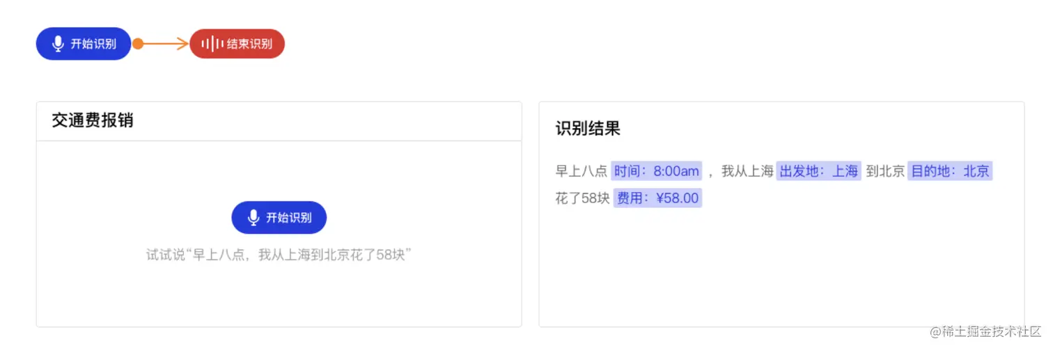 在某公司内部可以通过语音输入来报销打车费用,通过语音ASR模型可以将语音识别为文字,同时对文字信息进行信息抽取,抽取的信息主要是包括了4个方面,时间、出发地、目的地、费用,通过对文字4个方面的信息进行抽取就可以完成一个报销工单的填写。