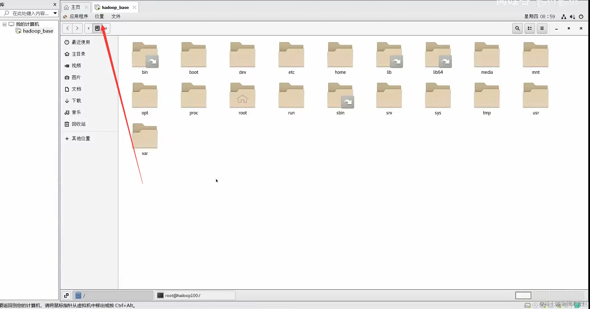 打开虚拟机,点击位置,打开计算机(相当于windows系统的我的电脑,你看到有箭头的文件夹都,并不是在此目录下)