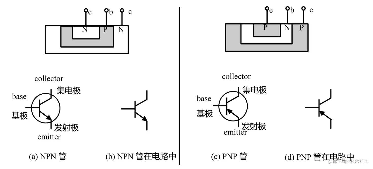 除基极外,带箭头是发射极,不带则是集电极。箭头朝外是 NPN,指向里面是 PNP.