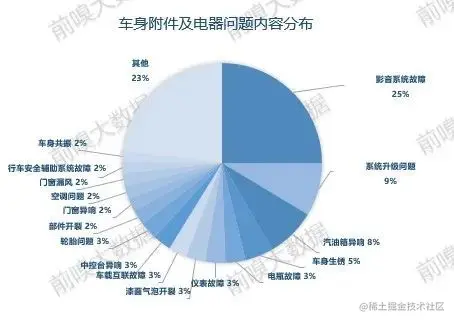 在车身附件及电器类问题中,用户投诉最多的是影音系统故障问题、占25%,其次是系统升级问题占9%,然后是汽油箱异响问题,占8%。