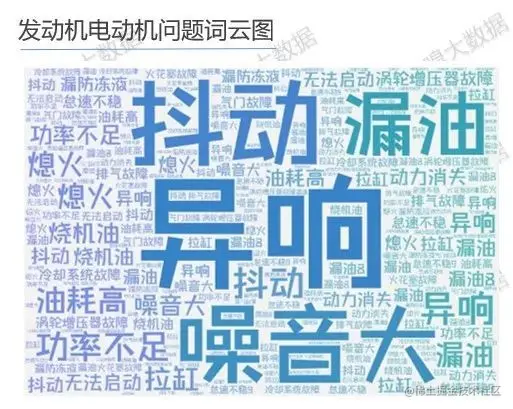 将用户投诉与发动机电动机相关内容分词,统计词频,并根据词频生成词云图。可以看出,在用户投诉关于发动机电动机的问题中,发动机异响、噪音大、抖动、漏油、功率不足、熄火等问题出现频次最多。