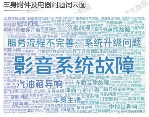 将用户投诉与车身附件及电器相关内容分词,统计词频,并根据词频生成词云图。可以看出,在用户投诉关于车身附件及电器的问题中,影音系统故障、服务流程不完善、系统升级问题、汽油箱异响、车身生锈等问题出现频次最多。