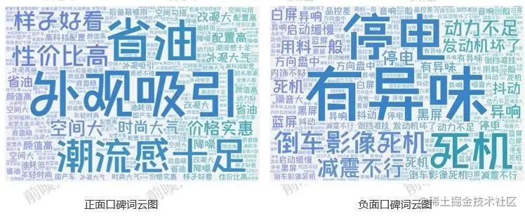 将用户口碑相关内容分词,统计词频,并根据词频生成词云图。可以看出,正面口碑中省油、外观吸引以及潮流感十足等词出现频次较多;负面口碑中停电、有异味以及死机等词出现频次较多。
