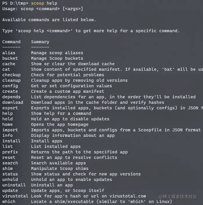 Scoop 安装完成后,可以使用 scoop help 获取帮助信息,可以发现 Scoop 有很多命令选项。