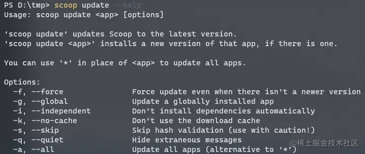 如果需要升级应用程序或者 Scoop 本身,只需要使用 scoop update 命令,详细信息可以加上参数 --help 获取。