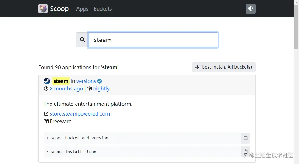 像是 git, vscode 这样的软件都可以通过 Scoop 安装,推荐使用这个网站:Scoop,可以找到大部分开发软件所在的存储桶,安装命令可以直接复制到命令行。