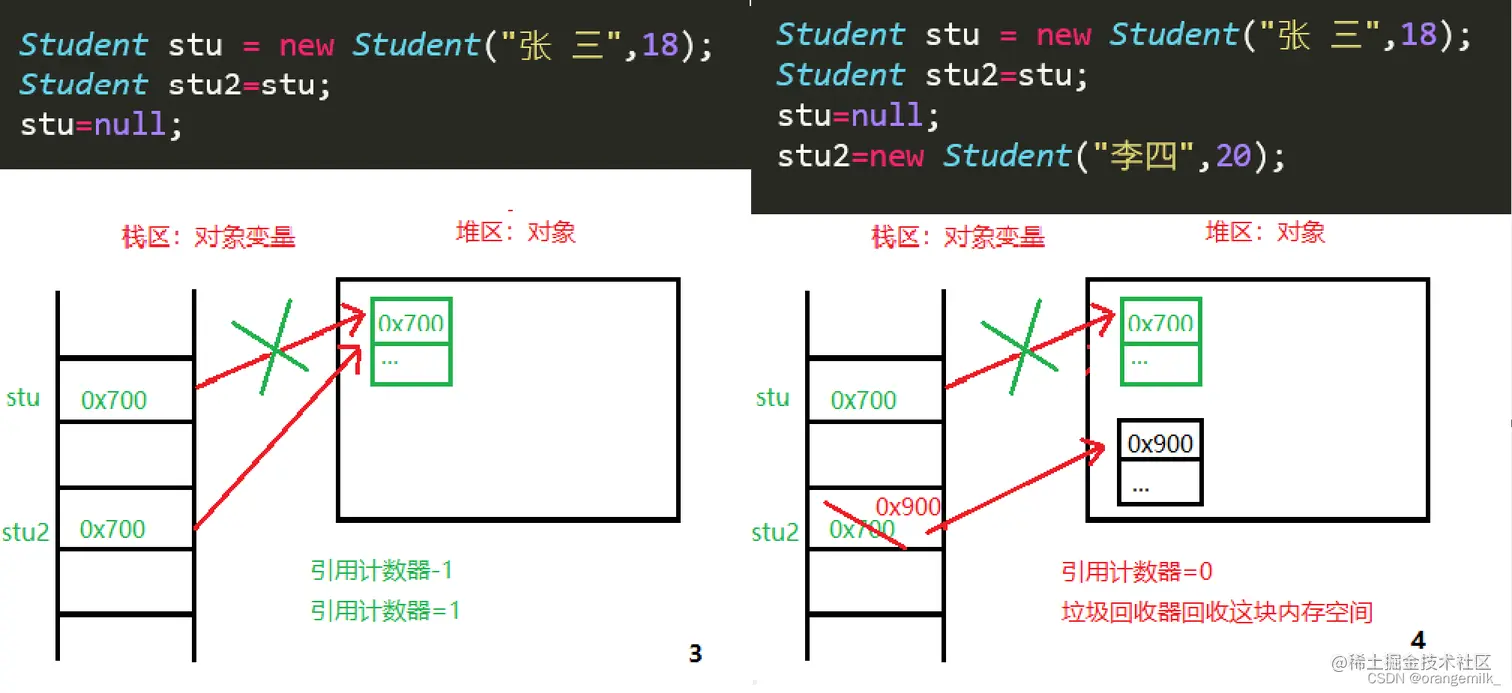 Student stu = new Student("张 三",18); Student stu2=stu; stu=null; stu2=new Student("李四",20);