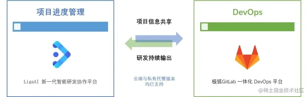 LigaAI 解决项目信息协同问题,而 GitLab 通过 DevOps 解决代码协同问题;二者的集成结合可进一步实现项目和代码的有效协同,最终达成三个层面的研发效能提升目标。