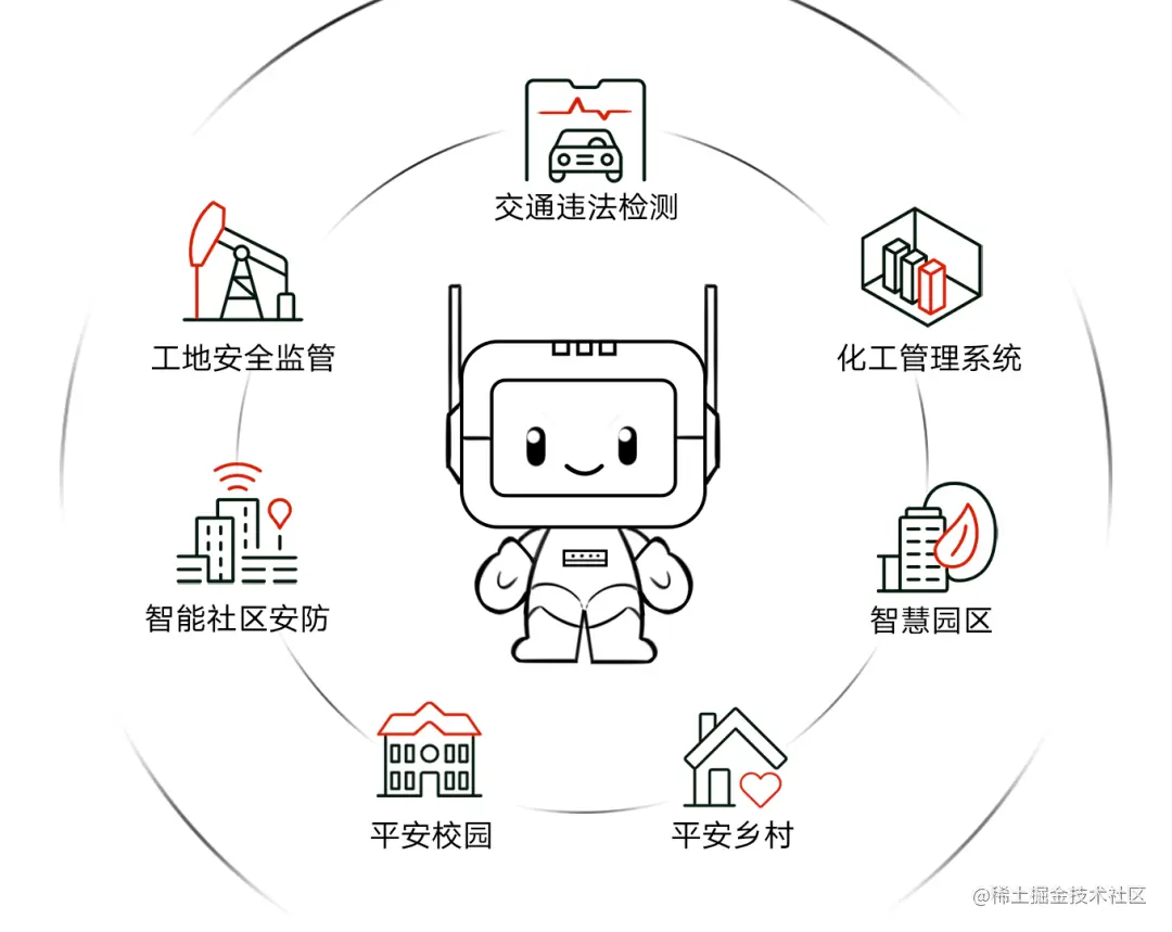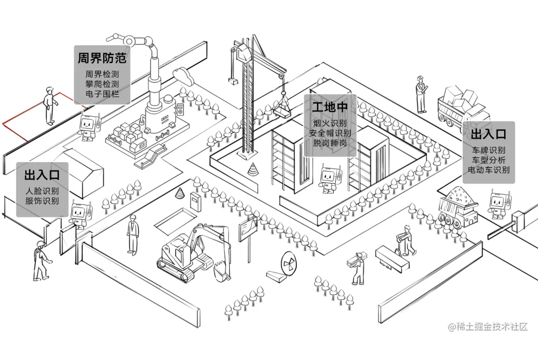 智慧工地中通常配备了大量的摄像头,iBox的部署为摄像头配置了智能AI算法。摄像头1安装在出入口负责检测人脸和服务合规;摄像头2安装在工地周界,负责检测爬高、非法入侵;摄像头3安装在工地中,负责烟火识别、脱岗睡岗、安全帽识别…… 而摄像头采集的视频流可实时上传给iBox。