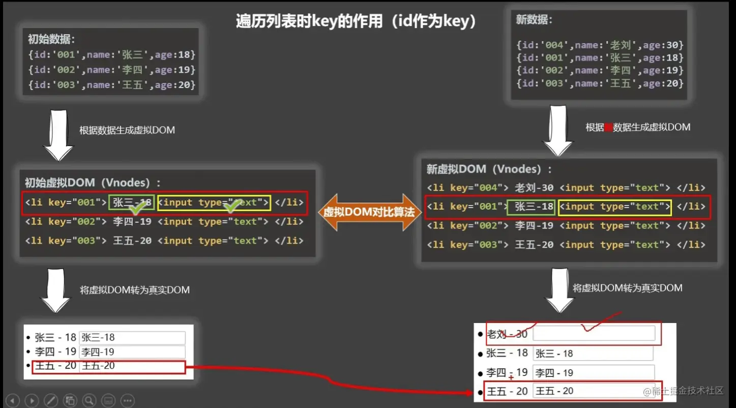 (2).旧虚拟DOM中未找到与新虚拟DOM相同的key 创建新的真实DOM,随后渲染到到页面。 3. 用index作为key可能会引发的问题: 1. 若对数据进行:逆序添加、逆序删除等破坏顺序操作: 会产生没有必要的真实DOM更新 ==> 界面效果没问题, 但效率低。