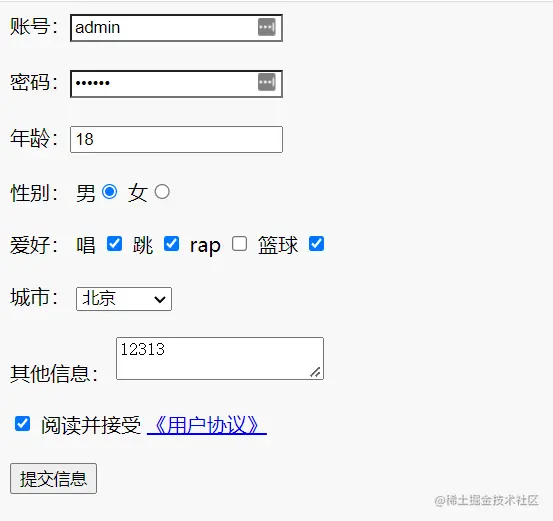 }) </script></html>//{"account":"admin","password":"123456","age":18,"sex":"male","hobby":["sing","dance","basketball"],"city":"beijing","other":"12313","agree":true}