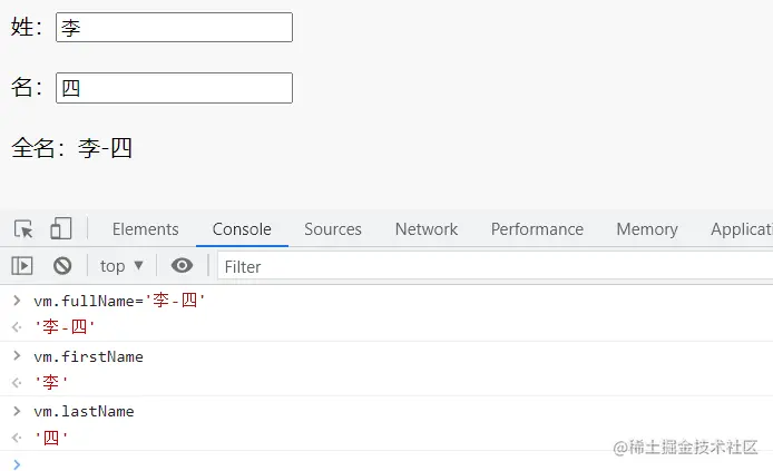const vm=new Vue({ el:'#root', data:{ firstName:'张', lastName:'三', }, computed:{ fullName:{ get(){ return this.firstName + '-' + this.lastName }, set(val){ const arr=val.split('-') this.firstName=arr[0] this.lastName=arr[1] } } }, }) </script></html>