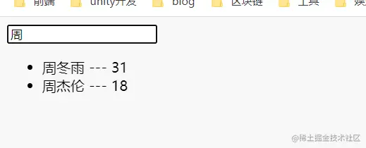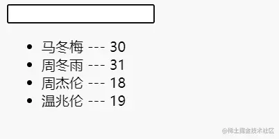 <!DOCTYPE html><html> <head> <meta charset="UTF-8" /> <title>列表过滤</title> <script type="text/javascript" src="../js/vue.js"></script> </head> <body> <div id="root"> <input type="text" v-model="keyName"> <ul> <li v-for="p in filPersons" :key="p.id"> {{p.name}} --- {{p.age}} </li> </ul> </div>