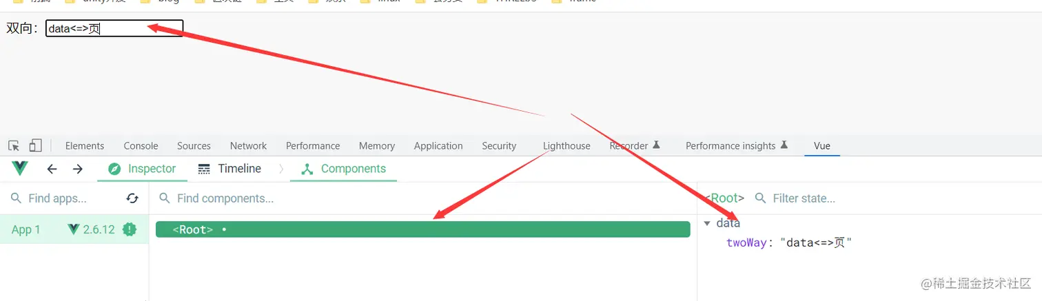 new Vue({ el:'#root', data:{ twoWay:'data<=>页面' } }) </script></html>