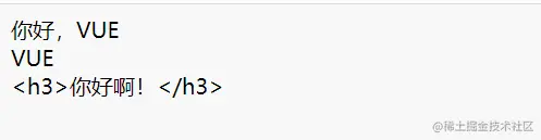 <script type="text/javascript"> Vue.config.productionTip = false //阻止 vue 在启动时生成生产提示。 new Vue({ el:'#root', data:{ name:'VUE', str:'<h3>你好啊!</h3>' } }) </script></html>