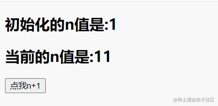 <h2 v-once>初始化的n值是:{{n}}</h2><h2>当前的n值是:{{n}}</h2><button @click="n++">点我n+1</button>