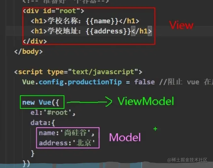 const vm = new Vue({ // 法一 // el:'#root', data:{ name:'VUE' } }) // 法二 vm.$mount('#root'); </script></html>