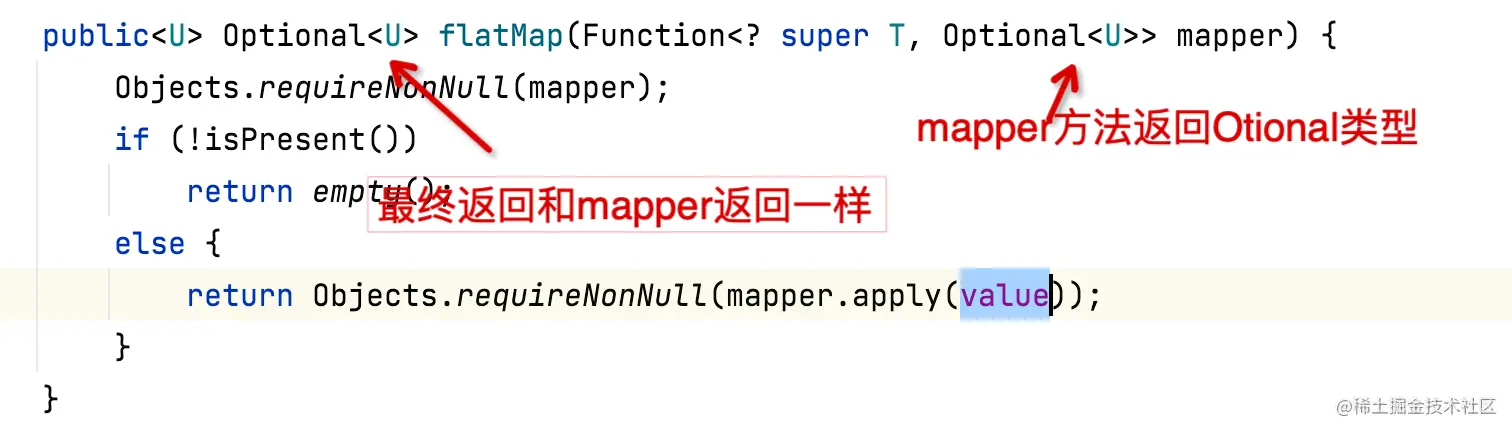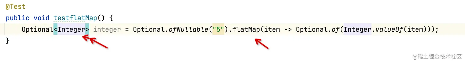 说明: 接受一个返回值为 Optional 的映射函数参数,该返回值亦是 flatMap 方法的返回值若结果为空,则返回 空 Optional。它也 map 的区别,我们用一个例子演示出来。