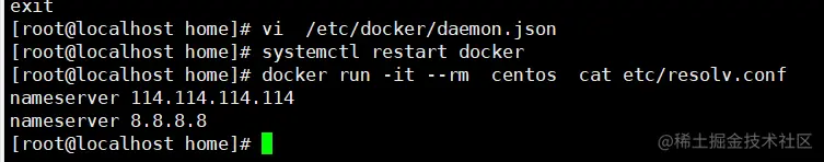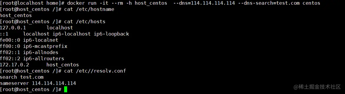 docker run -it --rm -h host_centos --dns=114.114.114.114 --dns-search=test.com centos