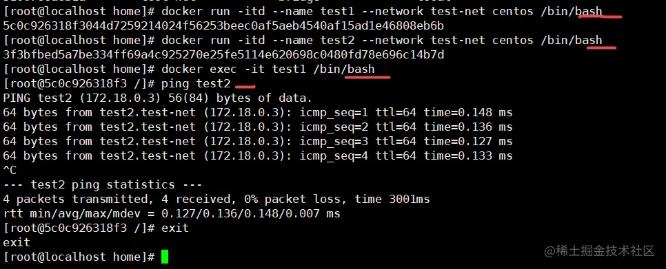 docker run -itd --name test2 --network test-net centos /bin/bash