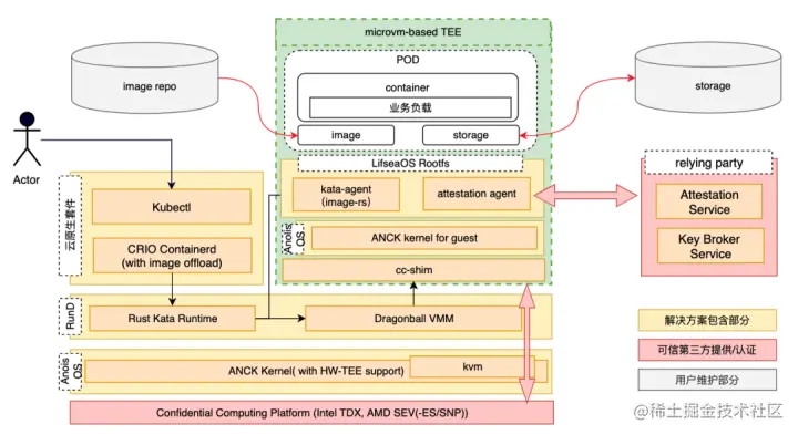 - kubelet 向 containerd 发起 Image Pulling 的 CRI 请求,containerd 则把请求转发给 kata-runtime/shim-rune,最终 kata-agent/enclave-agent 收到请求并通过 image-rs 子模块提供的容器镜像管理功能,在 TEE 内安全地执行拉取、验签、解密、unpack 以及挂载容器镜像的操作。
