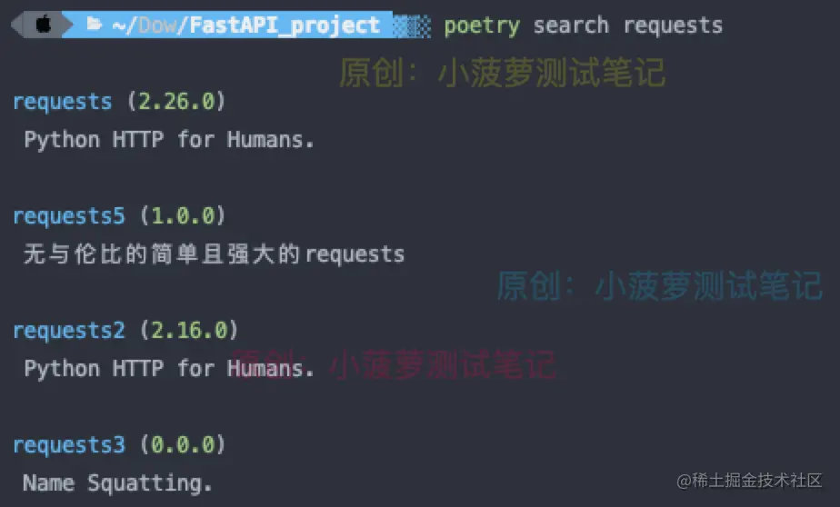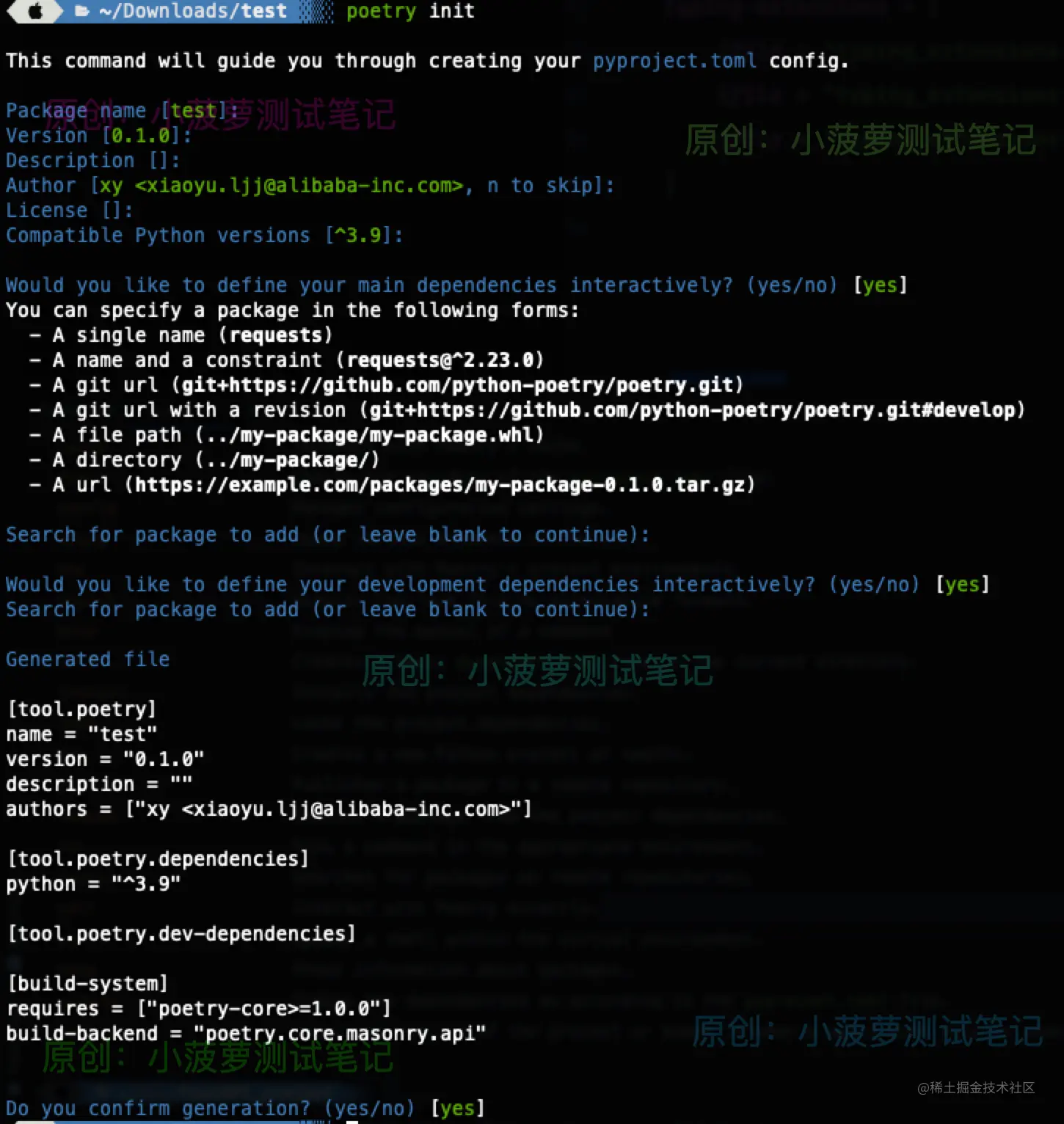 如果想在已存在的 Python 项目使用 poetry,可以用 init 命令,poetry 会以交互方式创建 pyproject.toml 文件