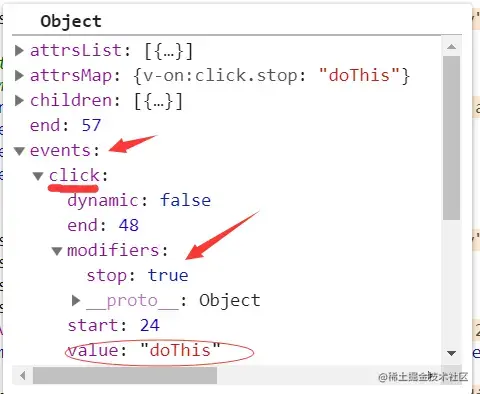 processAttrs的逻辑虽然较多,但是理解起来较为简单,var dirRE = /^v-|^@|^:/;是匹配事件相关的正则,命中匹配的记过会得到事件指令相关内容,包括事件本身,事件回调以及事件修饰符。最终通过addHandler方法,为AST树添加事件相关的属性。而addHandler还有一个重要功能是对事件修饰符进行特殊处理。