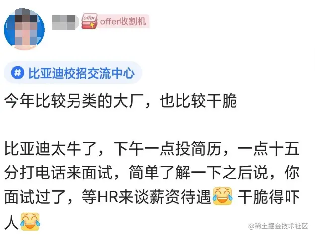 都说比亚迪今年疯狂招人,许多校招生都很顺利地收到了比亚迪的offer,究竟有多顺利呢?来看看这位网友的经历: