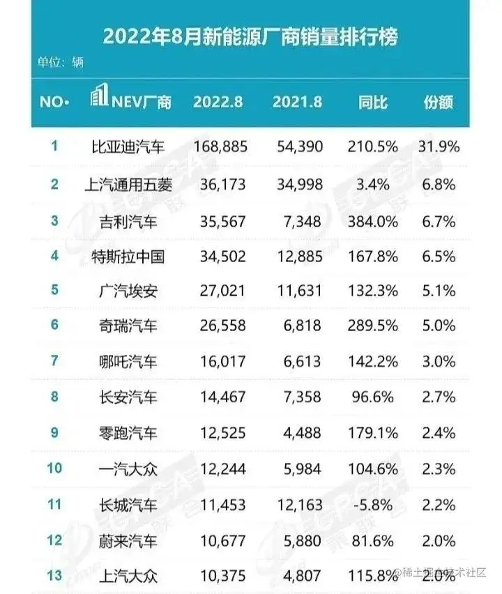 有人附上了2022年8月新能源厂商的销售排行榜,可以看到,比亚迪高居榜首,傲视群雄。