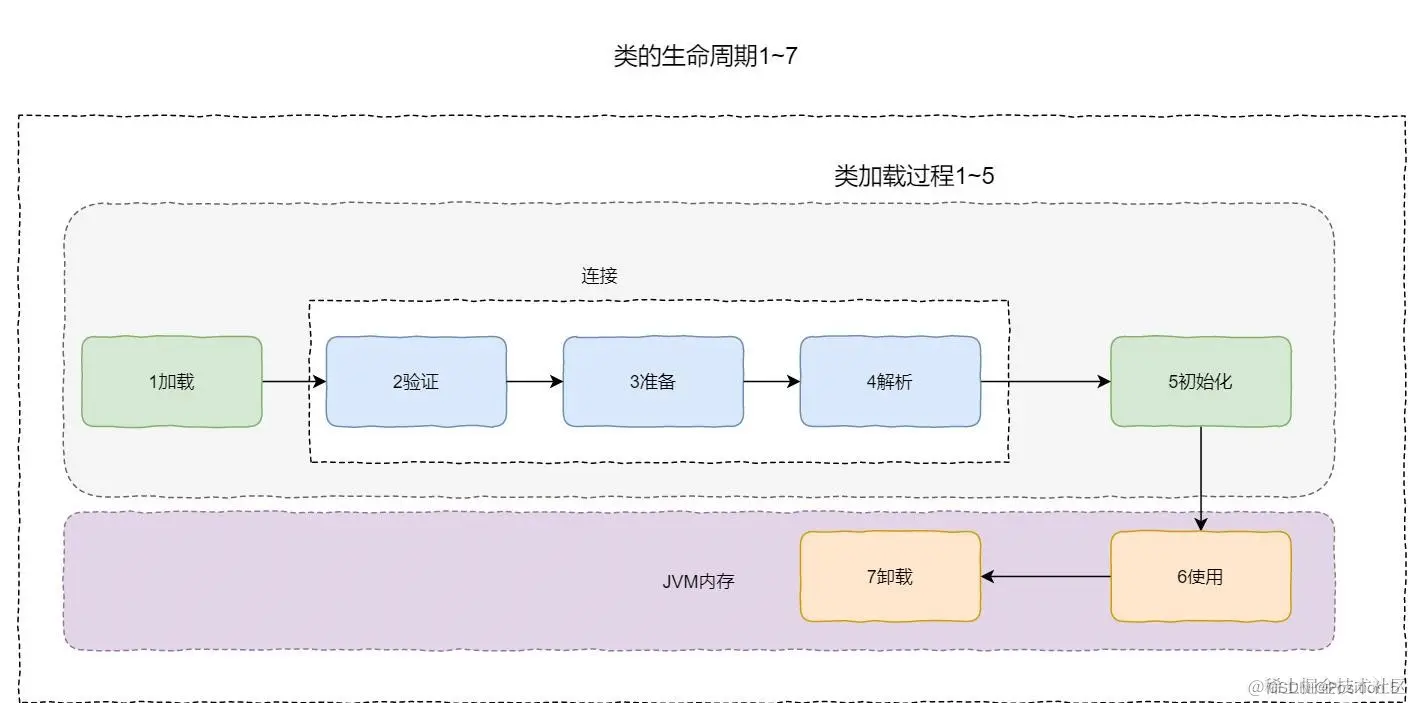 而又在 加载阶段,类加载器会将类对应的.class文件中的二进制字节流读入到内存中,将这个字节流转化为方法区的运行时数据结构,然后在堆区创建一个**java.lang.Class 对象**(类相关的信息),作为对方法区中这些数据的访问入口