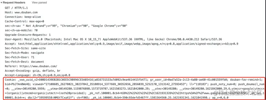 'Cookie': '_vwo_uuid_v2=D0BD1439EB2B1C0EE5C9B996CE5A85416|a816731533a7d092c9ea4614415fb471; gr_user_id=0ad7a52a-2c13-4a80-ae60-41c001559fb0; douban-fav-remind=1; bid=PbJTAn0We4Q; viewed="27108685_26278021_30237842_35188914_5377669_30352656_2856039_5252170_1313142_27593453"; ll="118183"; push_noty_num=0; push_doumail_num=0; __utmv=30149280.5959; __utma=30149280.1159876898.1573719787.1621503273.1621842000.29; __utmc=30149280; __utmz=30149280.1621842000.29.6.utmcsr=google|utmccn=(organic)|utmcmd=organic|utmctr=(not%20provided); _pk_ref.100001.8cb4=%5B%22%22%2C%22%22%2C1621931326%2C%22https%3A%2F%2Fwww.google.com.hk%2F%22%5D; _pk_ses.100001.8cb4=*; dbcl2="59599558:NMGtTCxaX1Y"; ck=FXN5; _pk_id.100001.8cb4=390c93defd5467ff.1581564560.25.1621931341.1621841998.; ap_v=0,6.0'