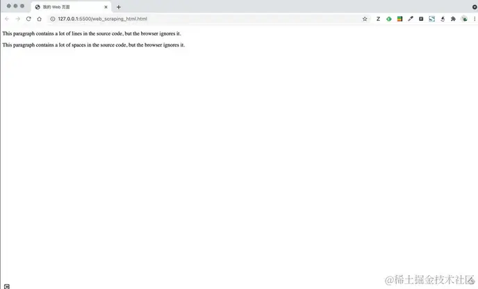 图中标红的文字为一个段落,是由 <p></p> 元素设置的。一个新的段落会另起一行,浏览器会自动地在段首和段尾加上一些空格。通过在 HTML 代码中添加额外的空格和空行是没办法改变页面的展示的。因为在页面展示的时候,浏览器会自动地去掉额外的空格和空行。例如,有如下代码: