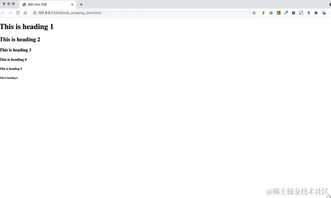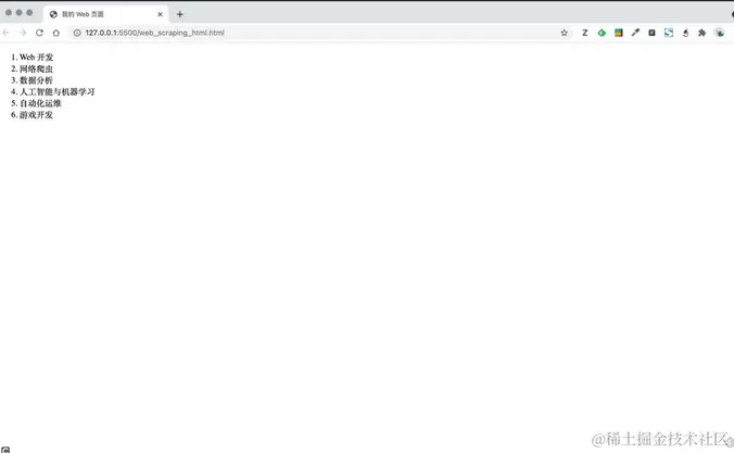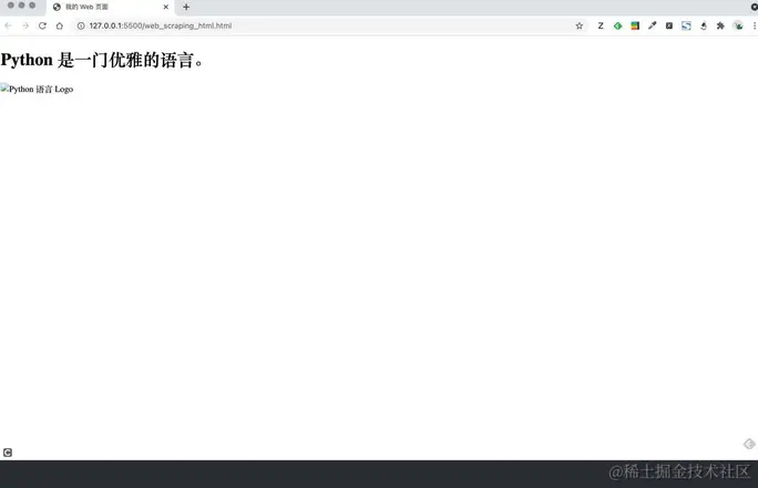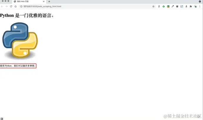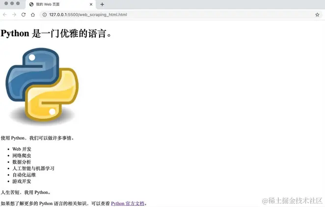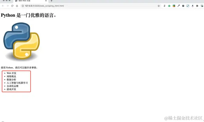 由于豆瓣网主页的 HTML 代码有 2000 多行,如果拿豆瓣网主页的 HTML 代码来讲解的话显得有点复杂了。所以我们从一个简单的 HTML 代码讲起。下图为一个简单的页面: