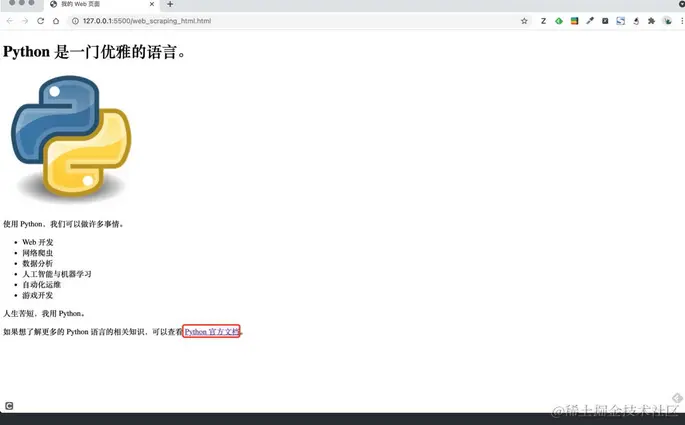 图中标红的部分为一个链接,是由 <a></a> 元素设置的。<a></a> 元素的 href 属性为链接的地址。<a></a> 元素的内容(Python 官方文档)会显示在页面上,当我们点击 Python 官方文档时,将会跳转到目的页面。我们不仅可以设置页面的链接,还可以设置图片、文件等的链接。