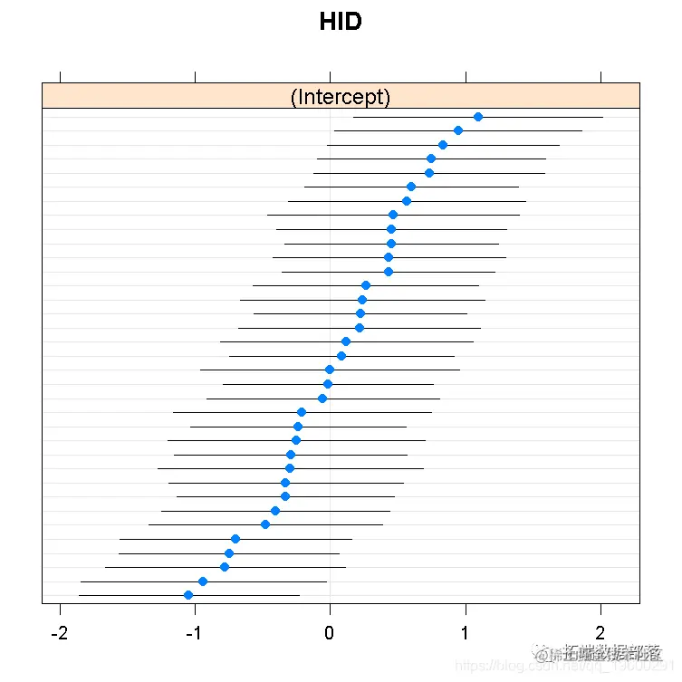 看一下条件模型的分布也是很有用的,下面我们用“毛毛虫图”来做。蓝点是带有误差条的条件模型。我们对医生和医院都是这样做的。例如,对于医生来说,我们可以看到一个有点长的右尾,即极端的正值比负值多。