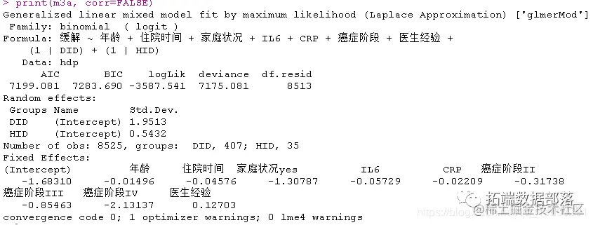 第一部分告诉我们,估计值是基于自适应高斯-赫米特的似然性近似。为了避免出现不收敛的警告,我们用参数control=glmerControl(optimizer="bobyqa")指定不同的优化器。