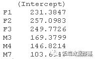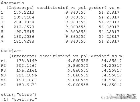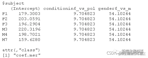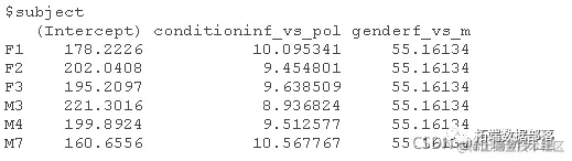 在这里,我们可以看到,这个模型为每个受试者产生了一个单独的截距,此外还有一个参数估计值/斜率的条件和性别,在各受试者中是恒定的。从这里,我们可以尝试根据这些系数来估计一个给定样本的平均音高 。例如,让我们尝试用他们估计的截距和作为女性的影响来估计受试者F1的平均数(x¯=232.0357)。