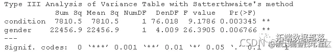 可以看到,我们的平均音调是192.88,非正式状态的音调比礼貌状态的音调高,b=9.71,t=3.03,女性的音调比男性高,b=54.10,t=5.14。我们可以使用一个经验法则,如果t大于2,就可能是显著的。