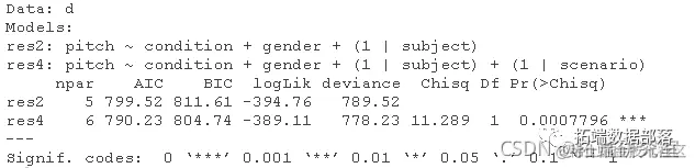 然而,其他人会认为,我们应该保持我们的模型最全面,并且应该包括随机斜率,即使它们没有改善模型!