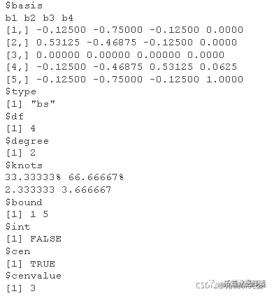 结果是一个列表对象,存储基础矩阵和定义该矩阵的自变量。在这种情况下,所选基准是具有4个自由度的二次样条,由参数类型df和度定义。