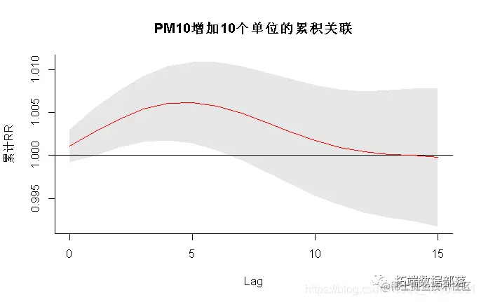 由DLNM估算的二维暴露-反应关系可能难以概括。关联的图形表示提供了一般描述。调用高级函数plot.default(),persp()和filled.contour()来生成散点图,3-D和等高线图。例如,臭氧和死亡率之间的关系可以通过RR进行总结,即每次滞后会比阈值高出10 µgr / m3。该图如图1(左)所示,可通过以下方式获得:
