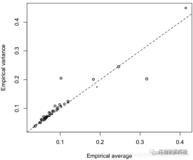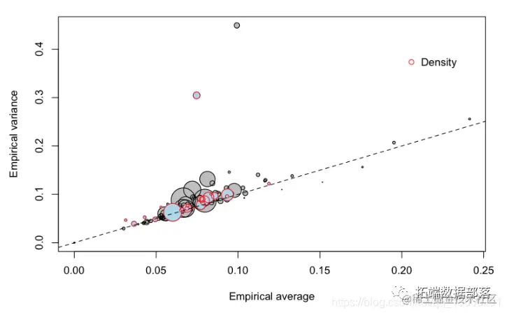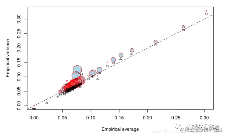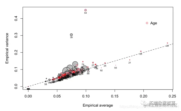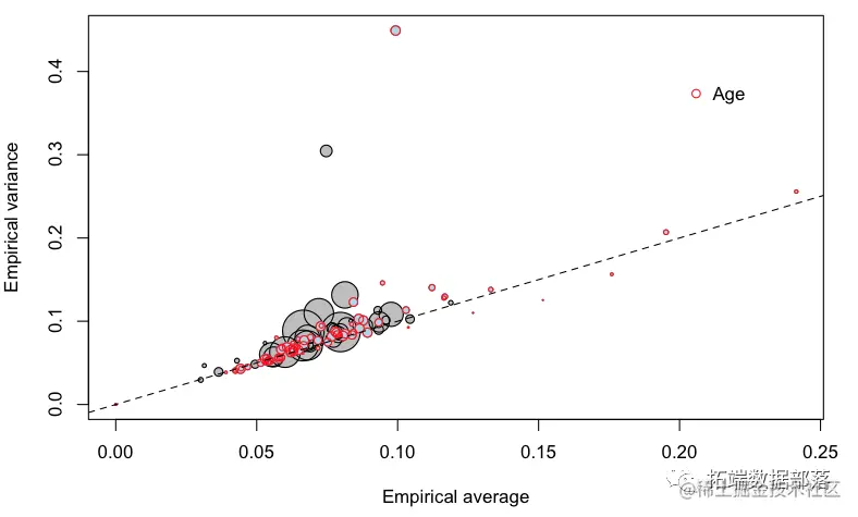 圆圈的大小与组的大小有关(面积与组内的总暴露量成正比)。第一个对角线对应于泊松模型,即方差应等于均值。也可以考虑其他协变量